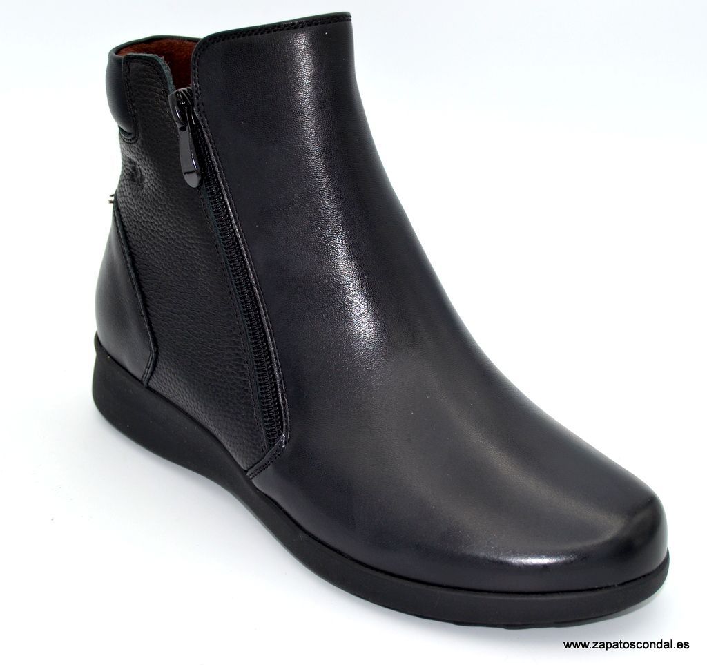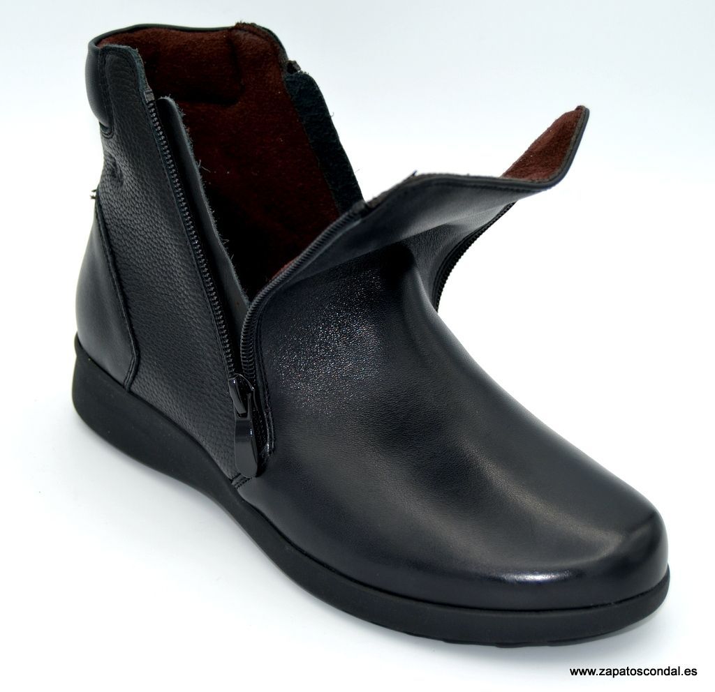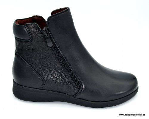 30´s Treintas modelo 4403. Botín de piel con dos cremalleras para un calce muy fácil. Forro térmico textil. Plantilla confort. Suela de caucho antideslizante. Horma ancho especial. Muy indicada para meter plantillas ortopédicas. Disponible en negro.