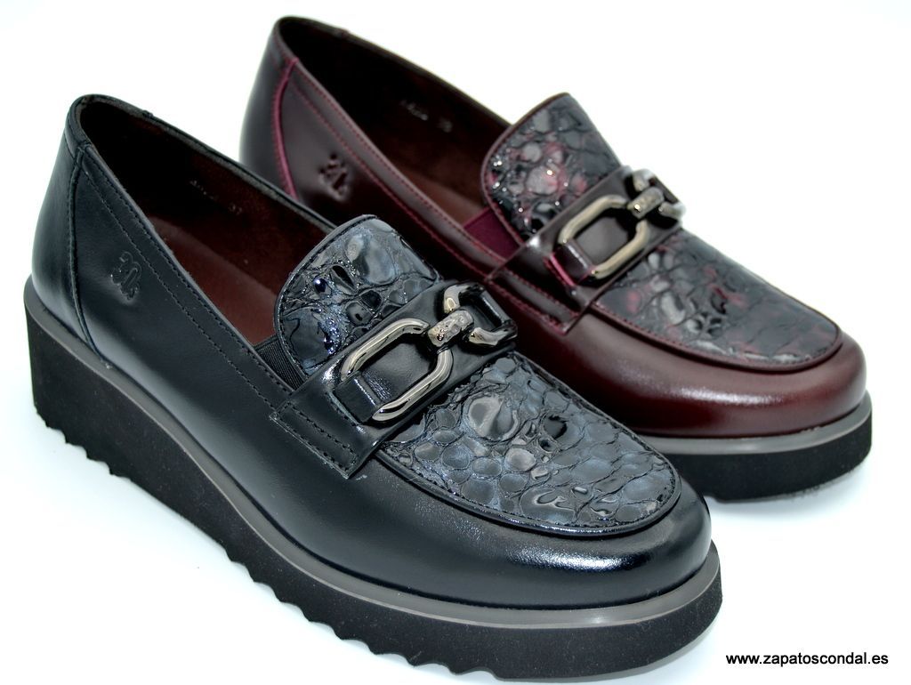 30´S Treintas modelo 4422. Zapato mocasín de piel con pala en charol grabado. Forro térmico textil Plantilla acolchada extraible. Suela de caucho microporoso muy ligero con cuña de 4cm. Adorno estribo metálico. Muy cómodos.