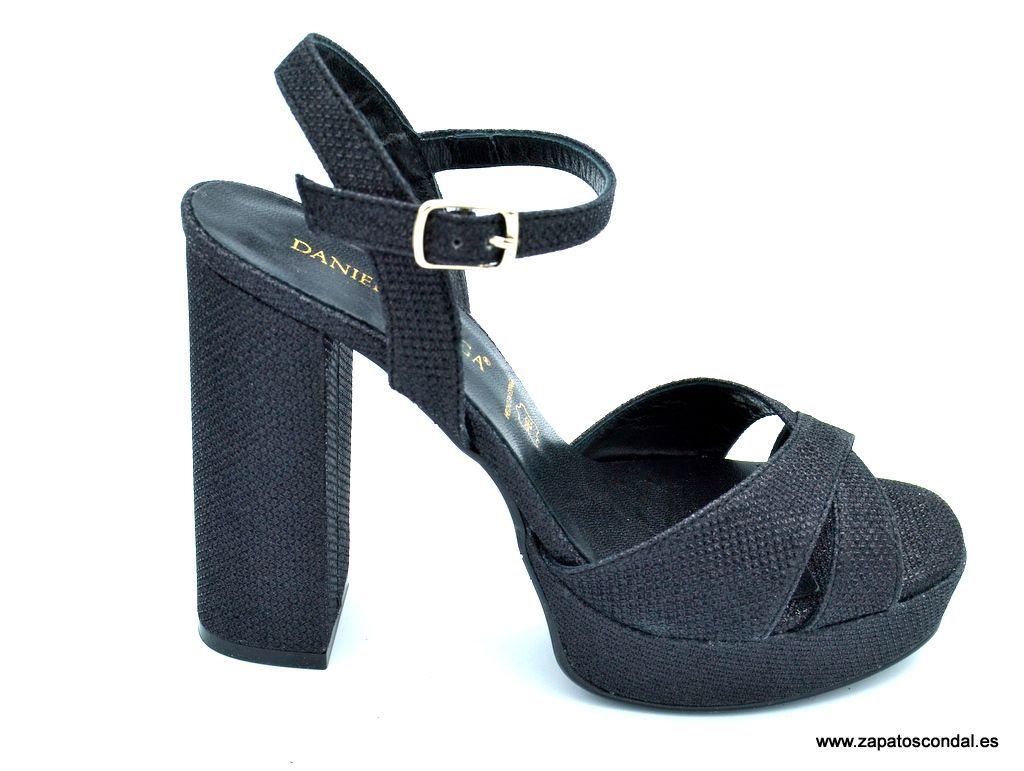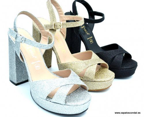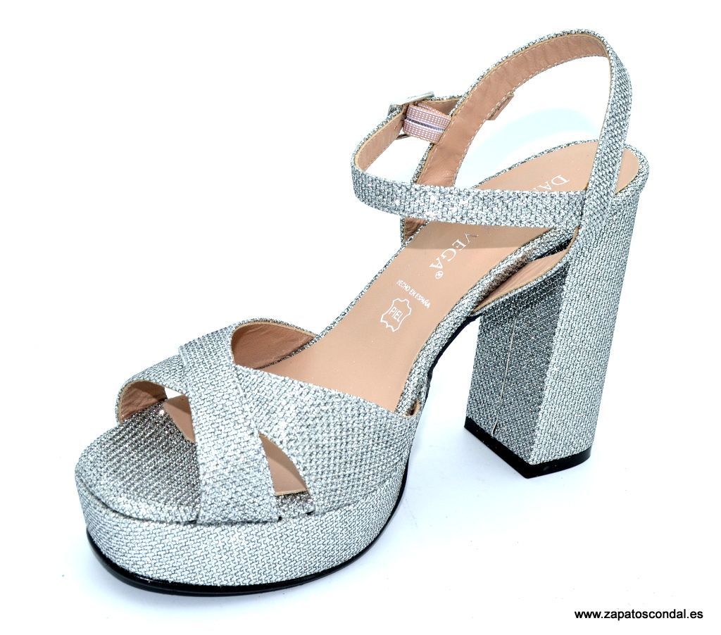 Daniela Vega modelo 1819-P. Sandalia de fiesta fabricada en tejido lux metalizado. Planta de piel. Suela de caucho con plataforma de 2,5cm. y tacón de 10cm. Disponibles en negro, plata y platino.