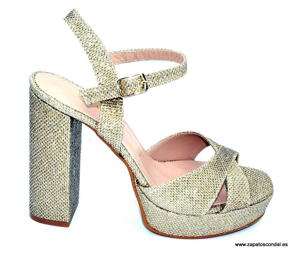 Daniela Vega modelo 1819-P. Sandalia de fiesta en tejido lux metalizado. Planta de piel. Suela de caucho. Tacón de 10 cm. con plataforma de 2,5cm. Disponible en negro, plata y platino.