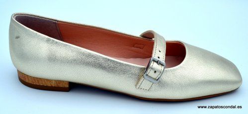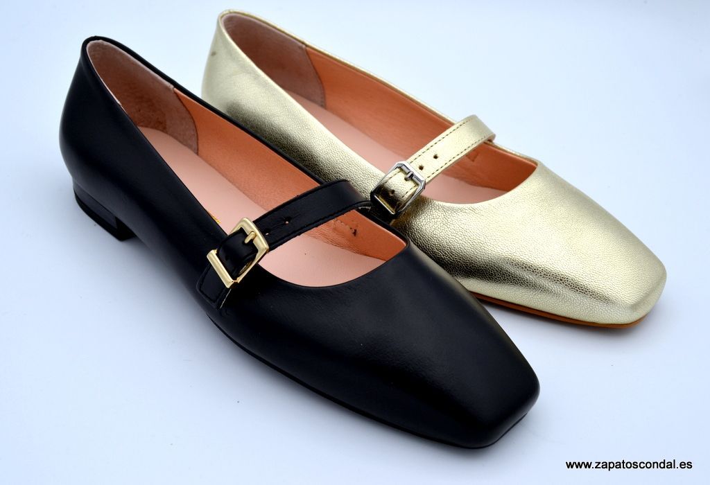 Duit modelo 6180. Zapato mercedes de piel con hebilla en el empeine. Forro y planta de piel. Suela de caucho. Tacón bajo de 1cm. Disponible en negro y metalizado oro. Fabricado en Elche-Alicante.