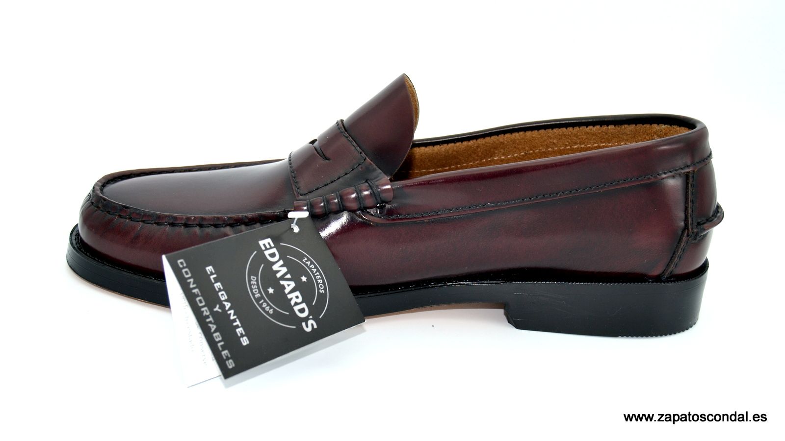 EDWARD´S MODELO 1001. Zapato mocasín en piel florentic de gran duración. Suela de cuero cosida. Castellano bien terminado y al mejor precio. Disponible en burdeos, negro y cuero.