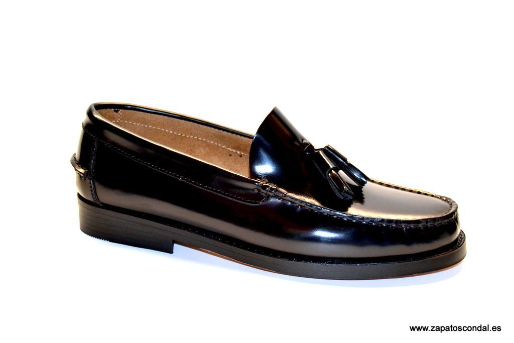 Zapato castellano en piel florentic con adorno borlas en el empeine. Suela de cuero cosida.