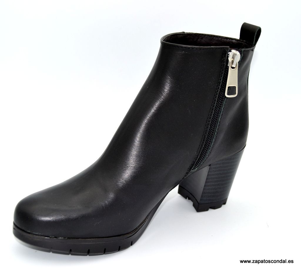 Elodie modelo CA1016. Botín de piel con cremallera lateral. Forro de piel. Suela de caucho antideslizante con tacón de 6,5cm. Disponible en negro. Fabricado en España.