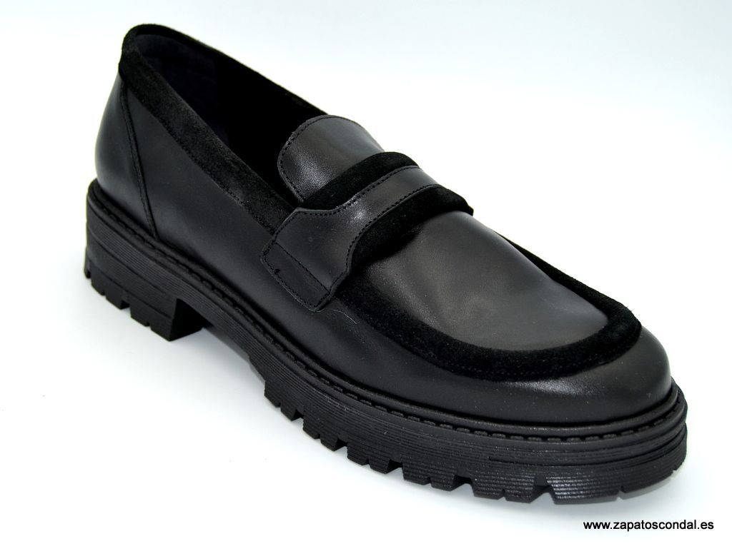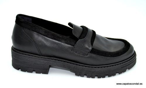 Elodie modelo CA2066. Zapato mocasín de piel con adorno antifaz en la pala. Forro de piel. Planta de piel. Suela de caucho antideslizante. Disponible en negro. Fabricado en España.
