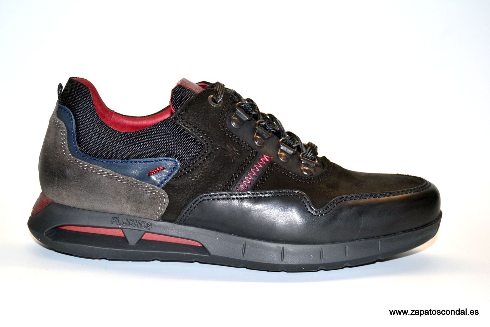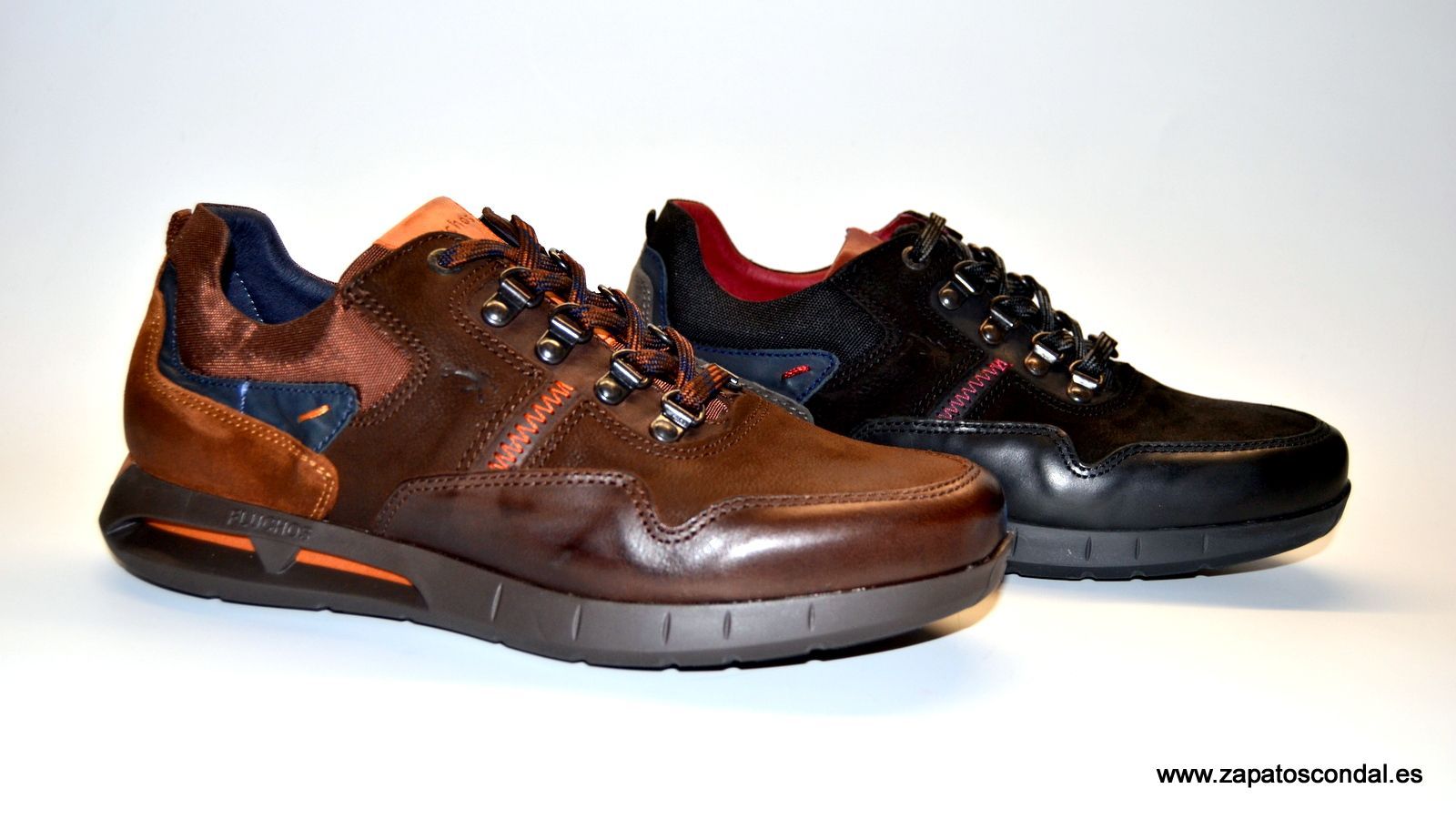 Fluchos modelo F0659. Deportivo de piel combinada. Ajuste con cordones en ganchos. Suela de gran calidad con cámara de aire. Disponibles en negro y marrón café.