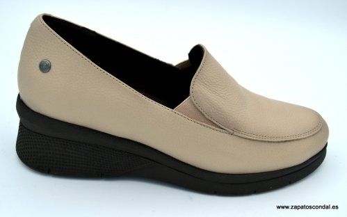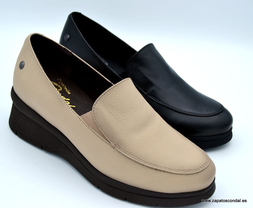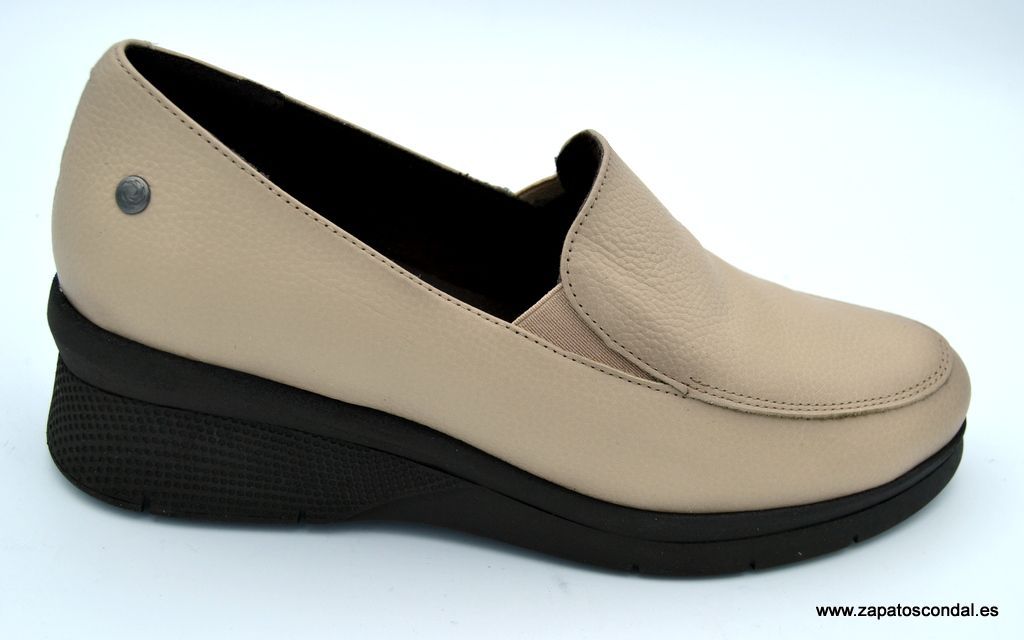 Kaola modelo 7614. Mocasín de piel. Forro traspirable. Planta de piel. Suela de caucho con cuña de 4,5cm. Fabricado en Elche- Alicante. Disponible en negro y beige topo.