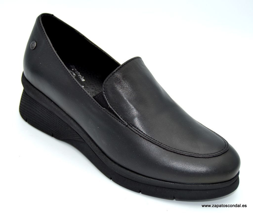 Kaola modelo 7614. Zapato mocasín de piel. Forro textil traspirable. Plantilla de piel. Suela de caucho con cuña de 4,5cm. Fabricado en Elche- Alicante. Disponible en negro y topo.