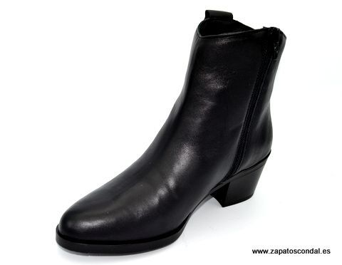 María Jaén modelo 5025. Botín de piel, forro textil. Planta de piel. Suela de caucho con tacón cubano de 5cm. Disponible en negro.