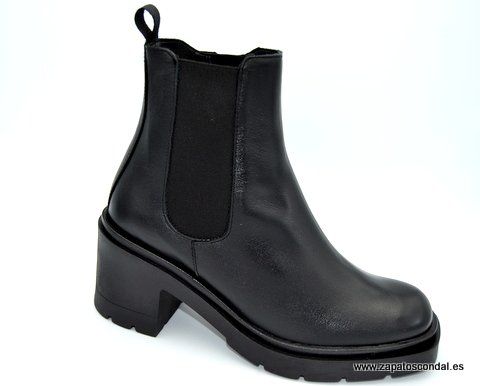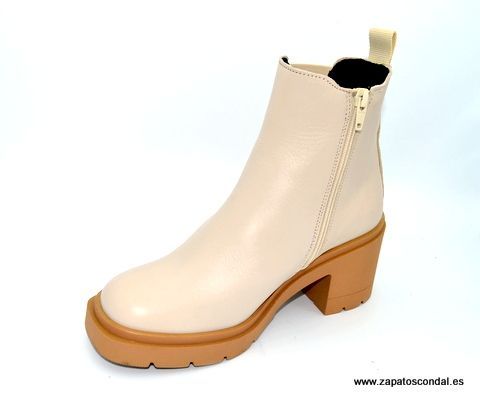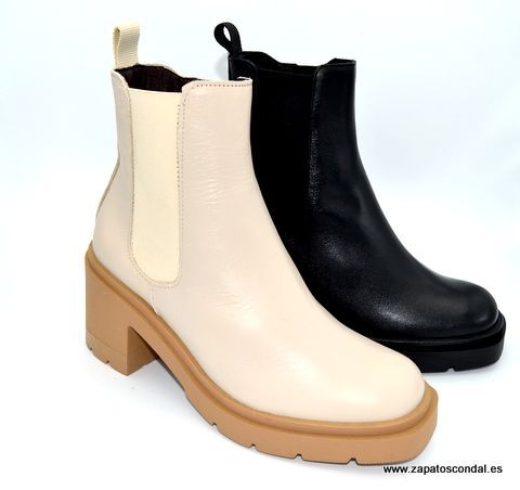 María Jaén modelo 5067. Botín de piel con elástico lateral y cremallera. Forro textil. Planta de piel. Suela de caucho con tacón de 5cm. Disponible en negro y beige salinas.