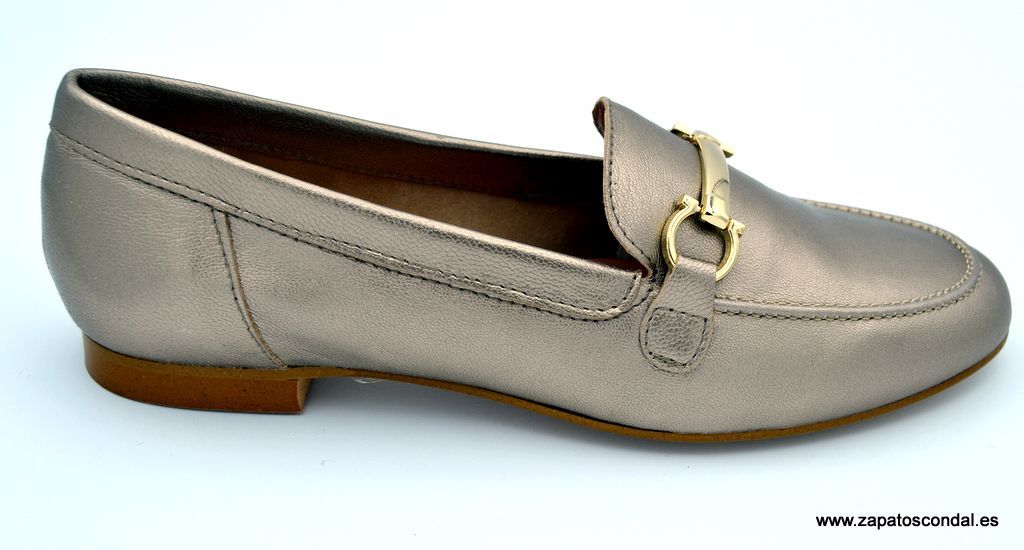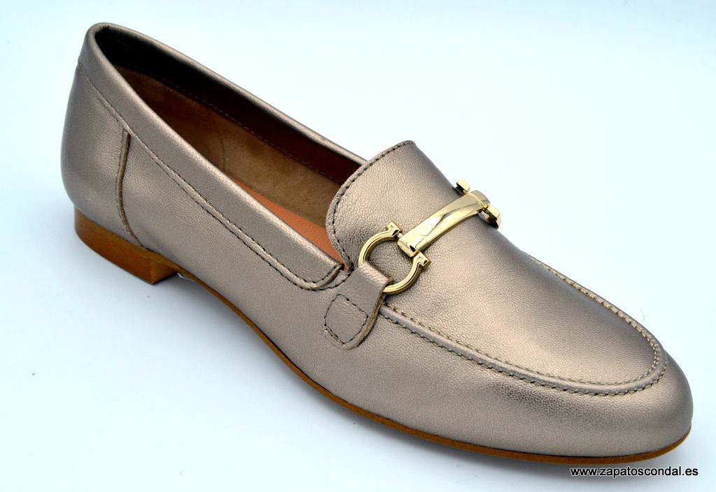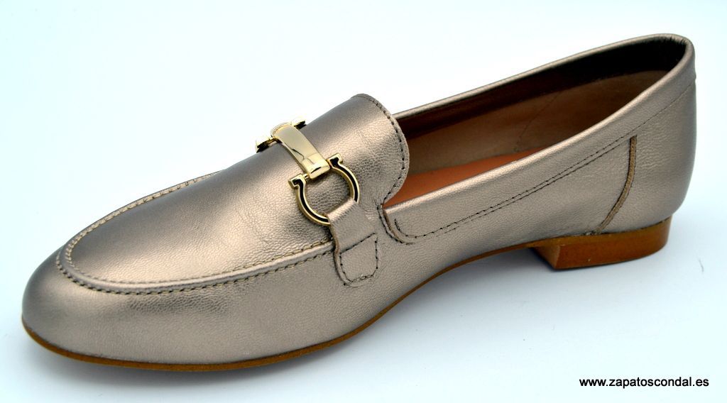 María Jaén modelo 8005X. Mocasín de piel con adorno metálico en la pala. Plantilla de piel. Suela de caucho con tacón de dos tapas. Disponible en metalizado cesio y negro. Fabricado en Elche- Alicante.