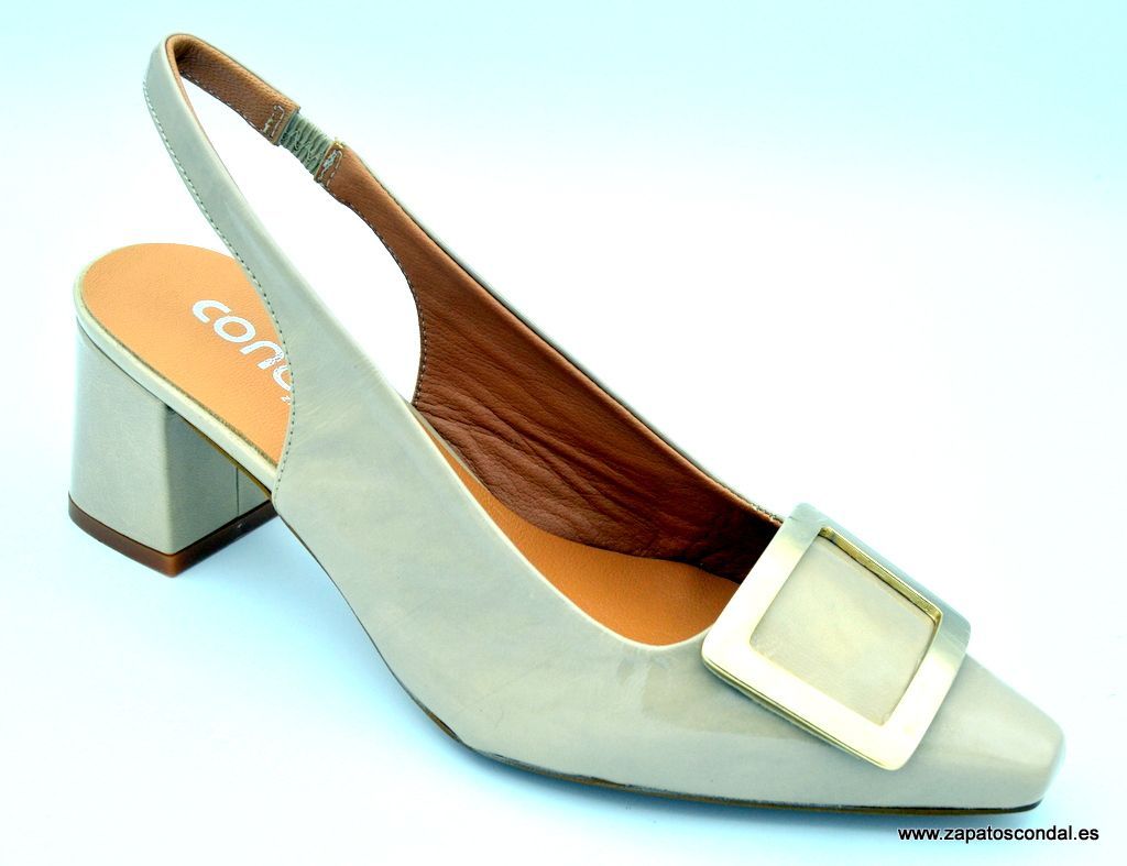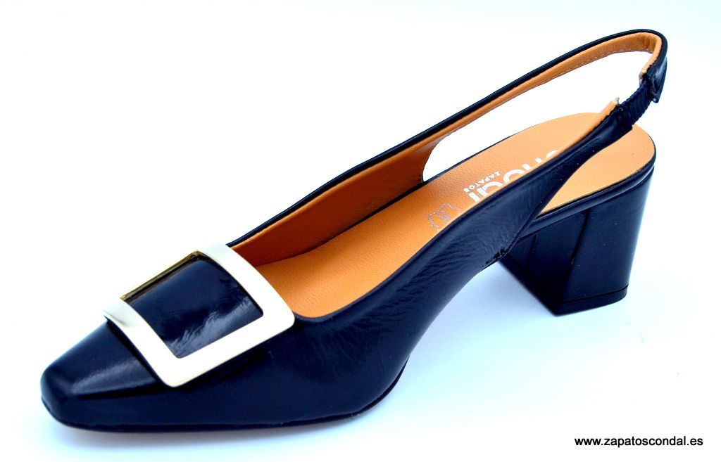 María Jaén modelo 8121. Salón destalonado de piel acharolada con adorno metálico cuadrado color bronce. Forro y planta de piel. Tacón de 5cm. forrado de piel. Suela de caucho pegada. Fabricado en Elche- Alicante. Disponible en negro y beige.