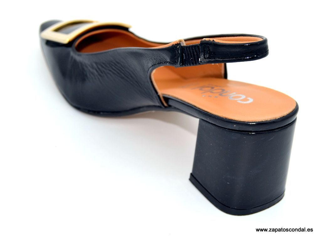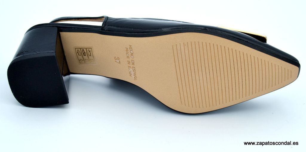 María Jaén modelo 8121. Zapato salón con talón abierto fabricado en piel acharolada. Forro de piel. Planta de piel. Tacón cuadrado de 5cm forrado de piel. Suela de caucho. Disponible en negro y beige.