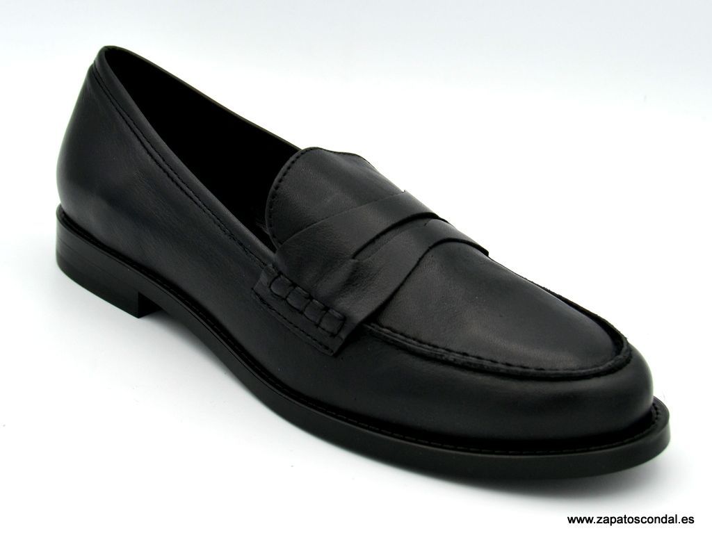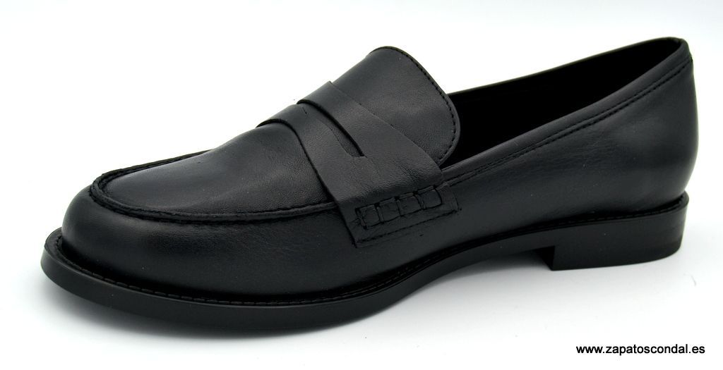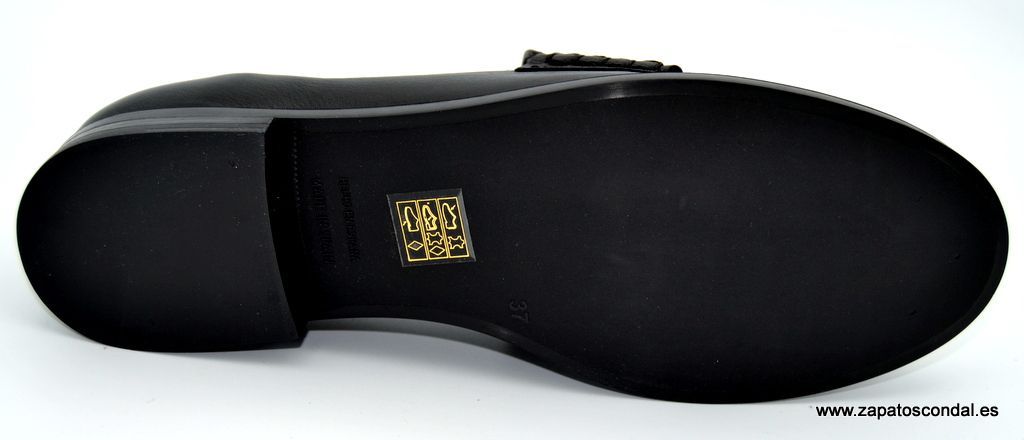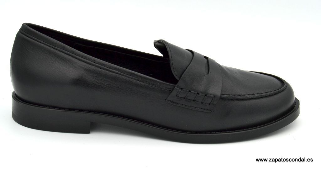 María Jaén modelo 9555. Mocasín de piel con adorno antifaz. Forro mixto piel. Suela de caucho con tacón bajo. Calidad y comodidad. Fabricado en Elche, España. Disponible en negro.