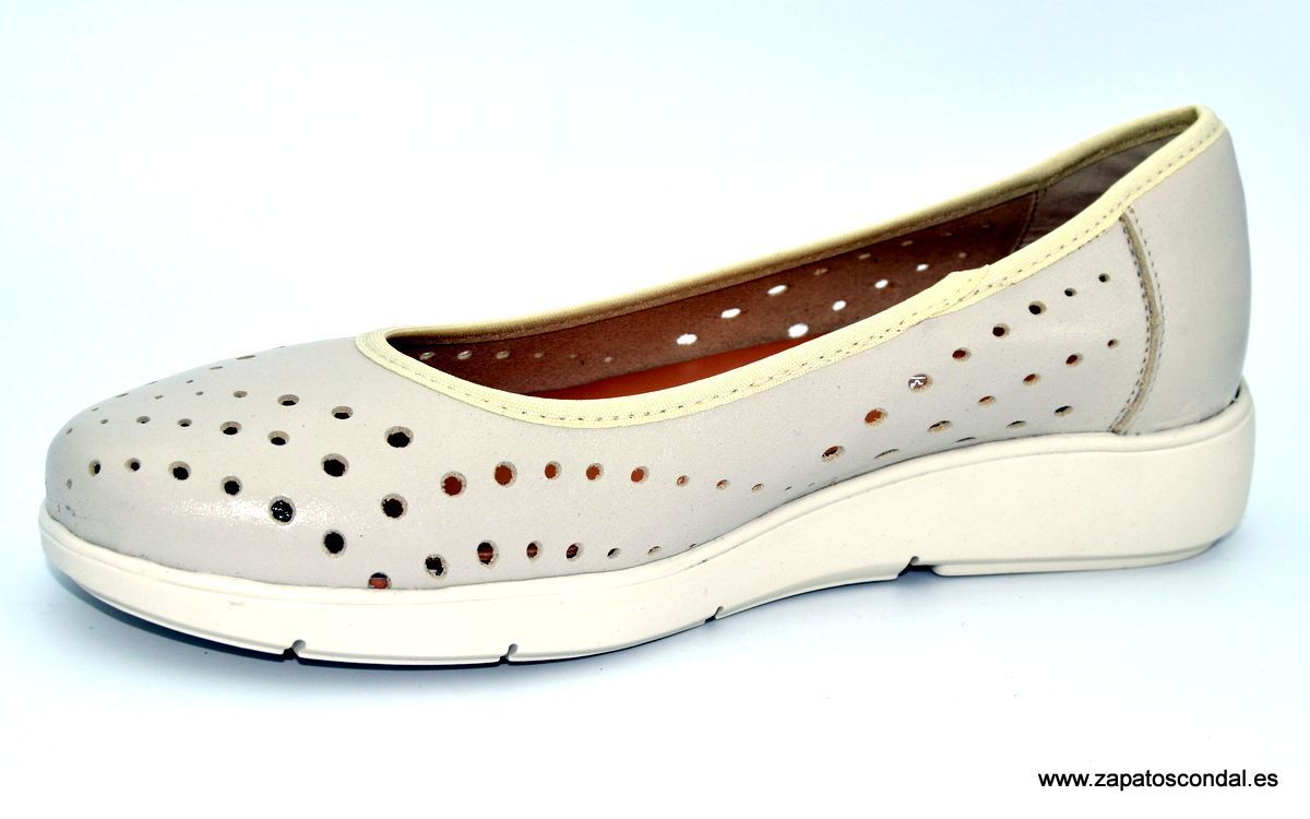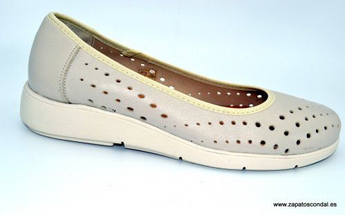 María Jaén Condal modelo 2011. Salón de mujer en piel napa perforada. Suela de caucho muy flexible y confortable. Plantilla acolchada especial confort. Disponible en color hielo.
