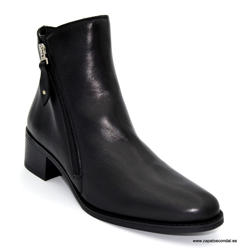 María Jaén modelo 9010. Botín de piel con cremallera exterior. Suela de caucho con tacón de 4cm. Forro mixto piel. Disponible en negro.