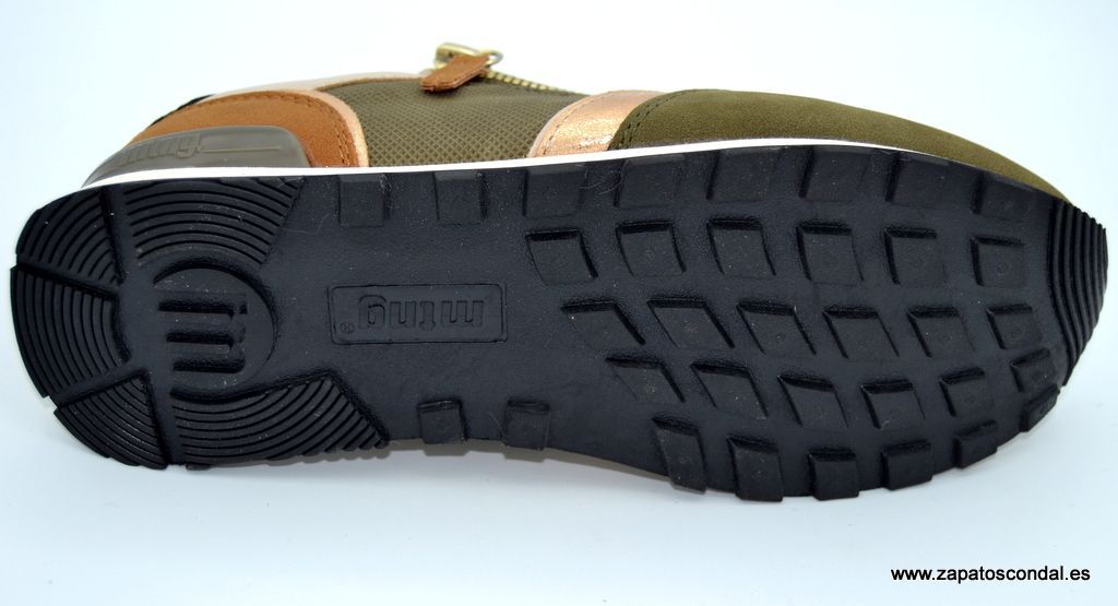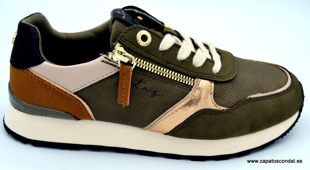 Mustang modelo 60391. Deportivo de mujer con cremallera y cordones. Tejido resistente al agua. Forro textil. Plantilla confort. Suela de caucho con buen agarre. Disponible en beige y verde kaki.