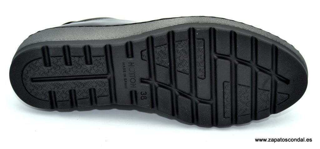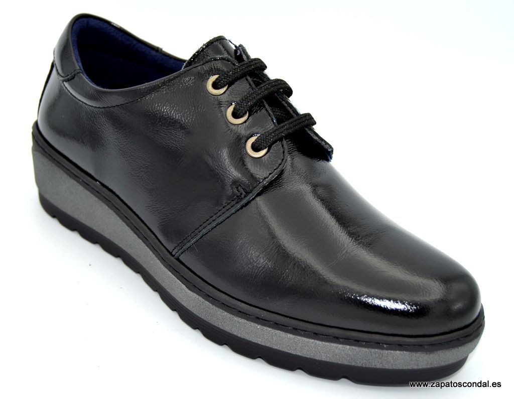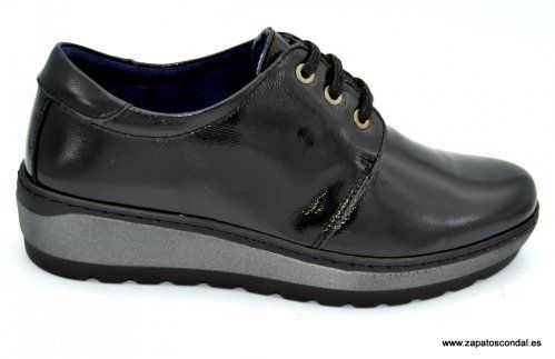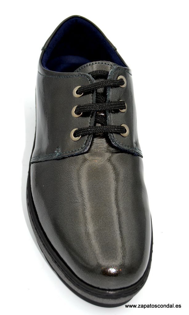Notton modelo 3051. Zapato de cordones de piel charol. Forro traspirable. Plantilla confort extraible. Suela ligera cosida con plataforma de 2cm. Gran calidad y comodidad. Disponible en negro y gris.