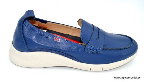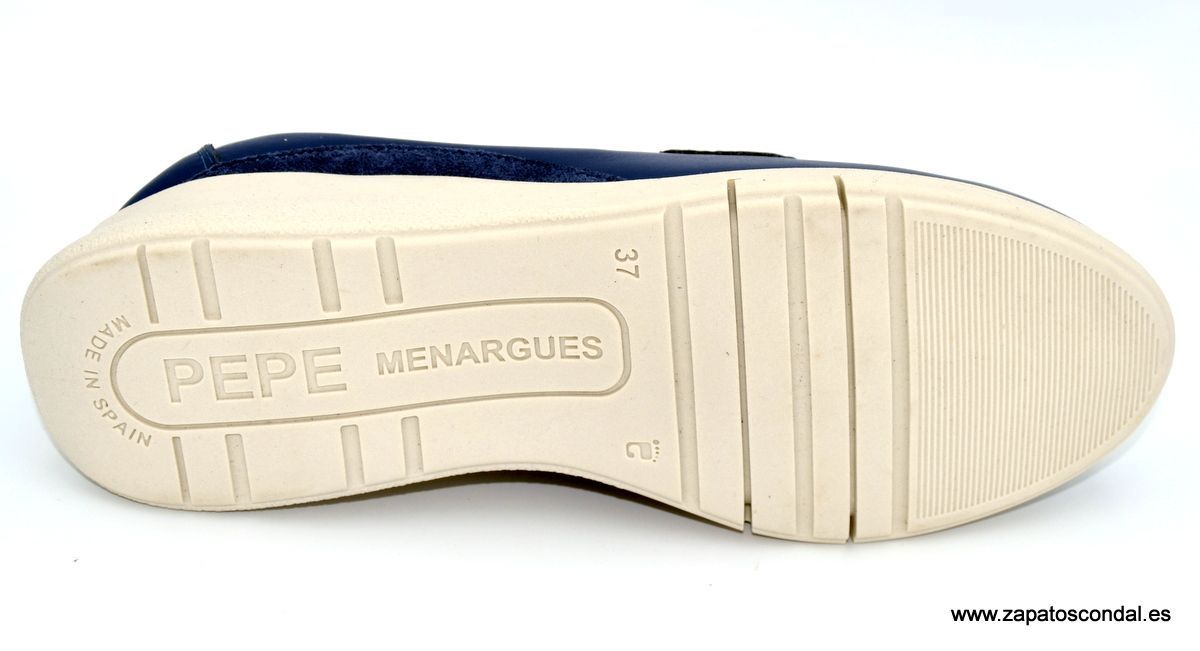 Pepe Menargues modelo 10790. Mocasín de piel. Forro micro traspirable. Plantilla extraible. Cuña de caucho de 3cm. Disponible en azul y camel.