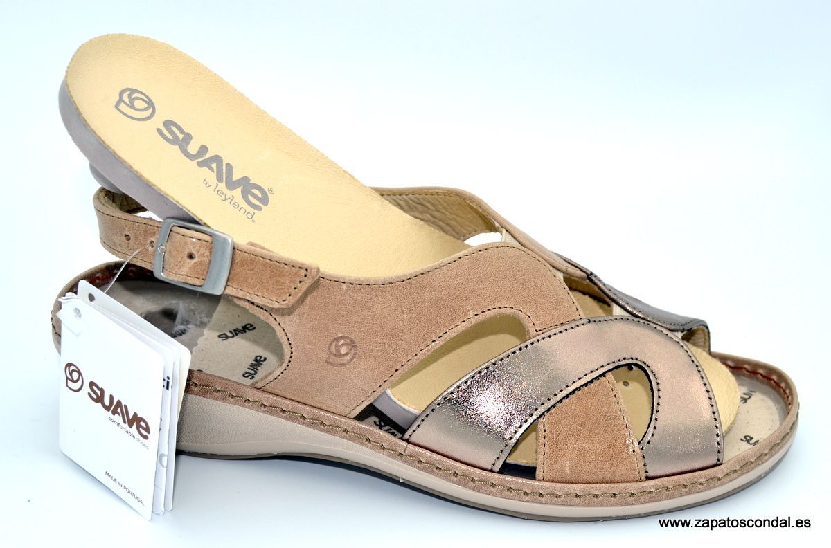 Suave Leyland modelo 3000. Sandalia de piel. Forro de piel. Plantilla extraible anatómica de piel. Suela de caucho con cuña de 3cm. Disponibles en beige/platino y azul/jeans.