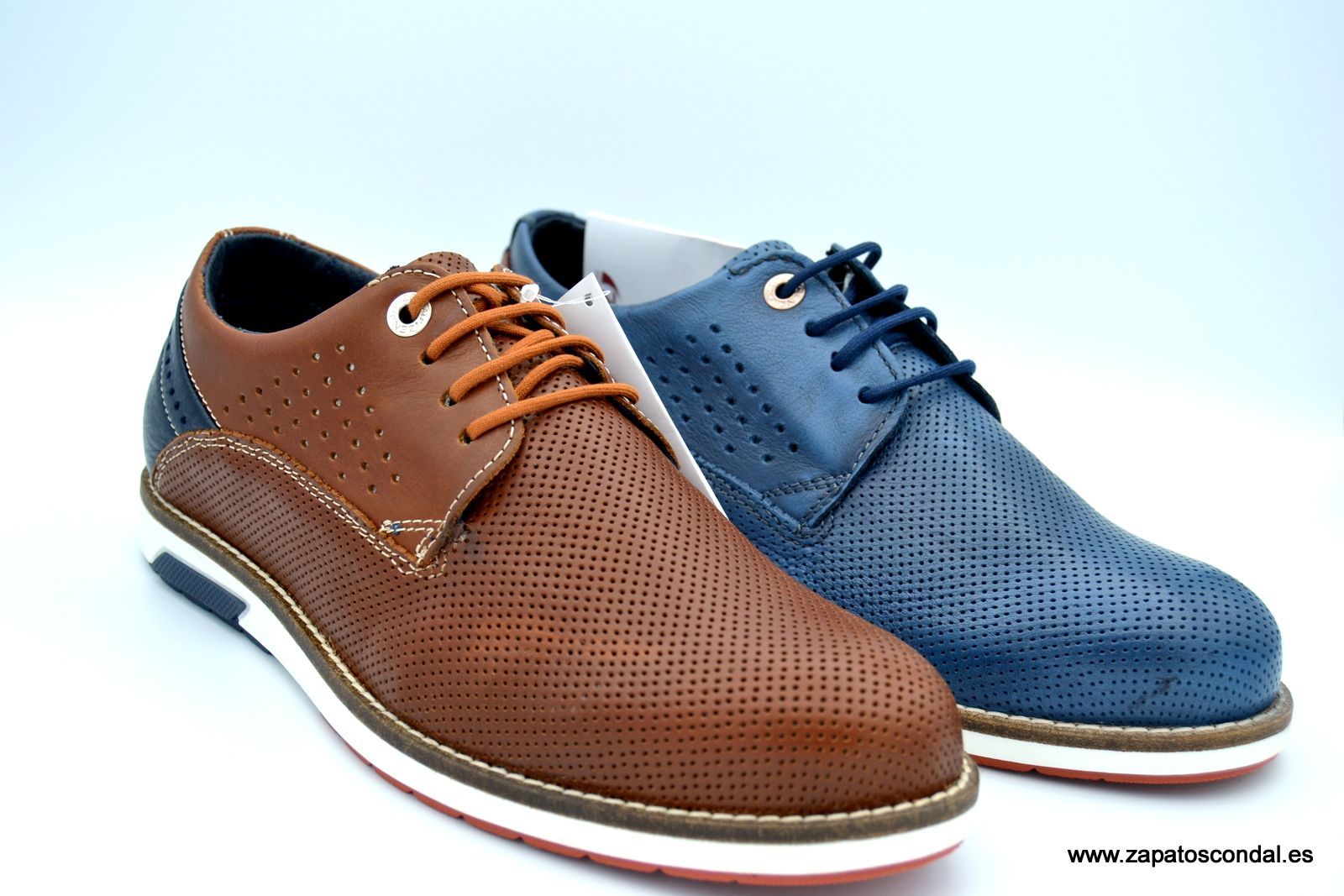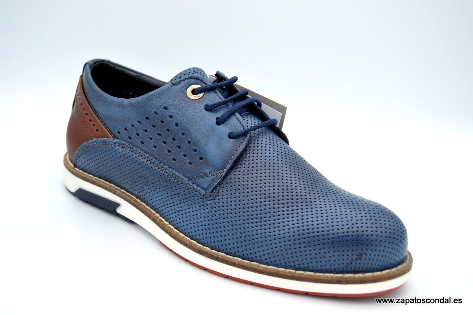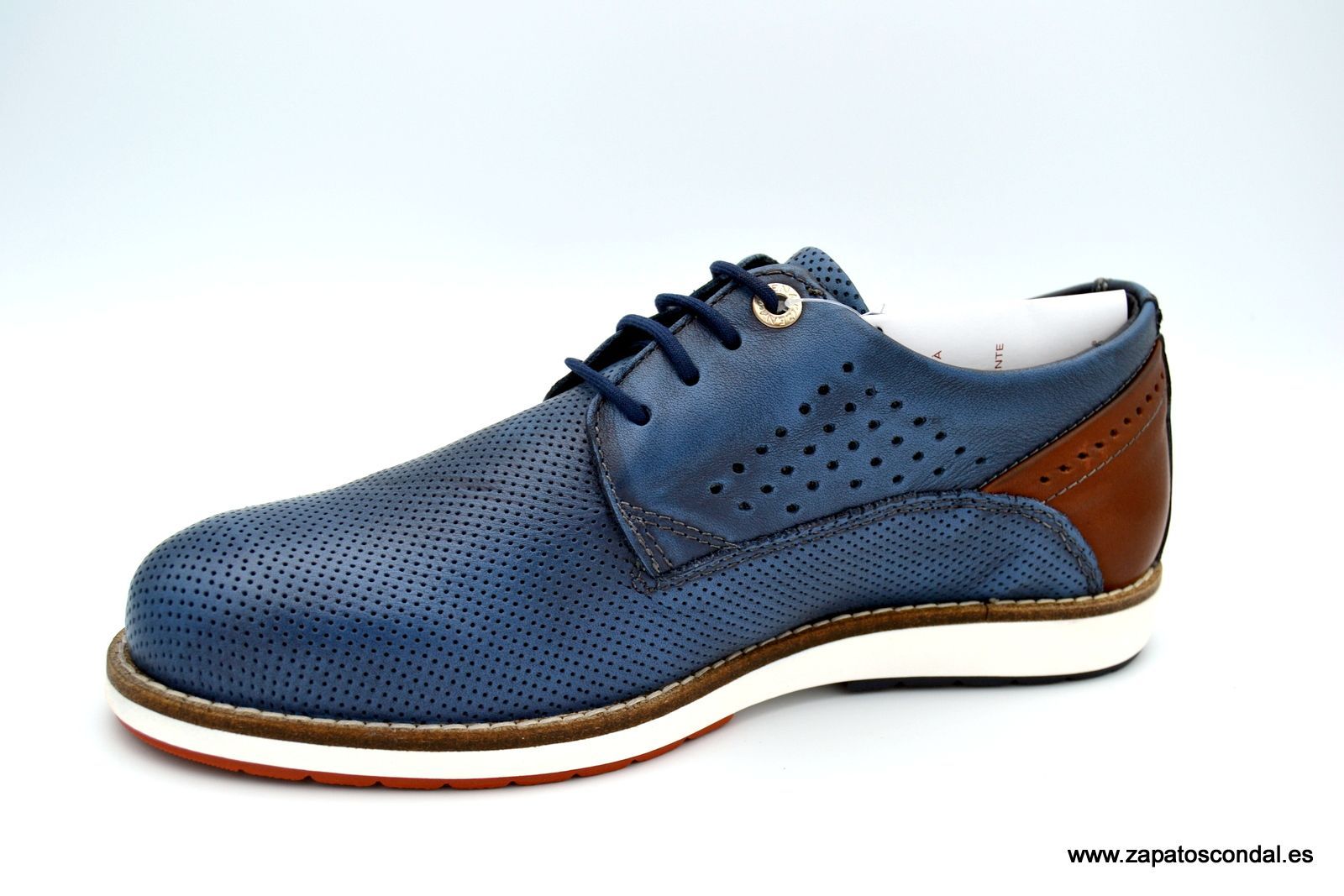 Zapato de cordones en piel microperforada. Suela combi blanco/azul. Diseño italiano.